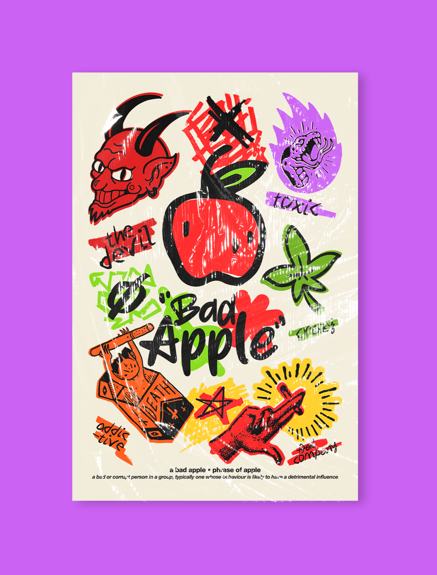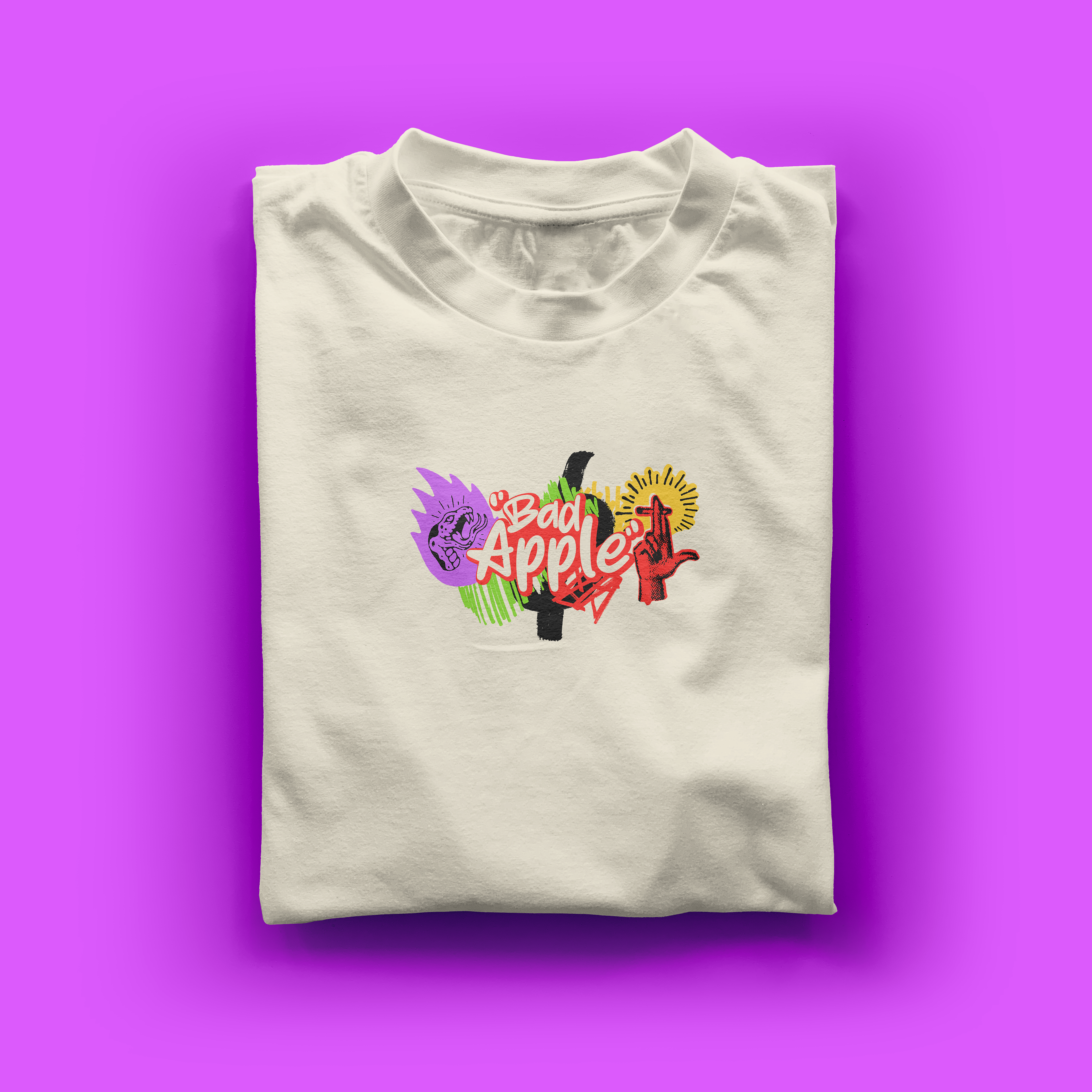 This street style design is based on the phrase "a bad apple," which is used to describe someone who has striking character traits or bad habits. The bright and contrasting colors are meant to emphasize these traits. The mixed media look is achieved by using multiple effects.