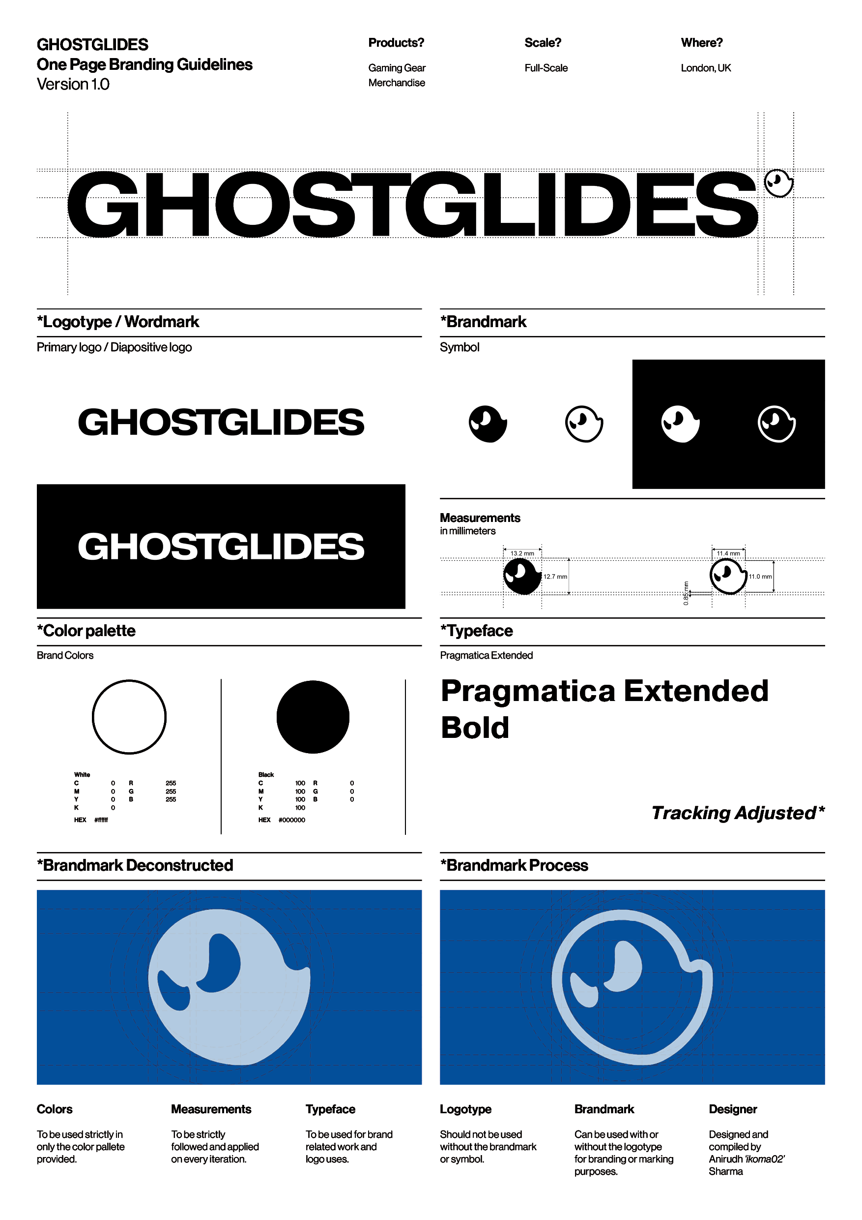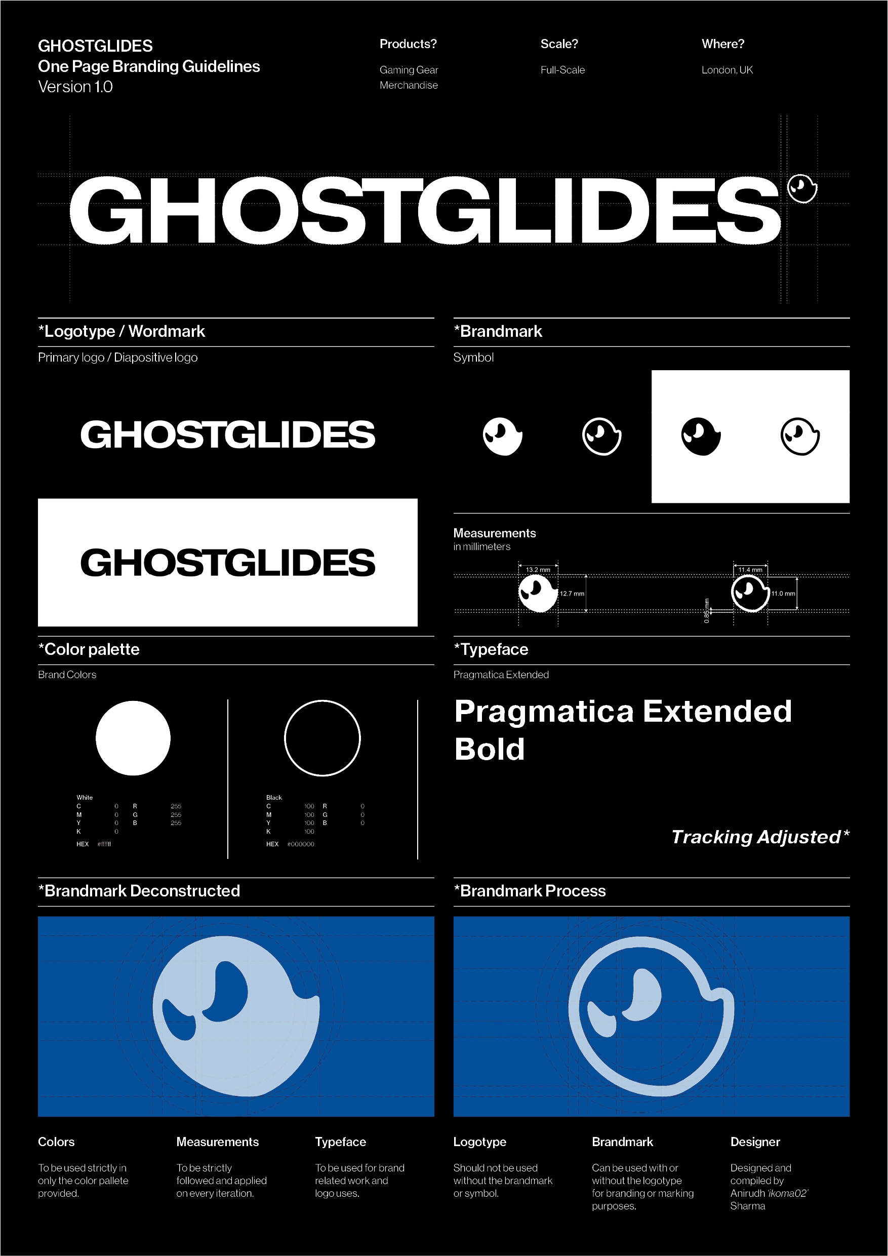 The mark here is a gliding ghost, made using concentric circles and a pair of concentric circles offset from the main set of circles, the mark is bold enough to be used as the small element with logotype and is unique enough to be used individually as a brand-mark.